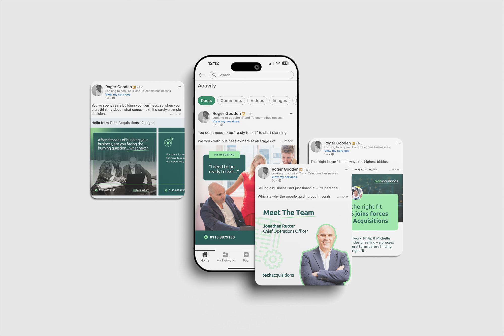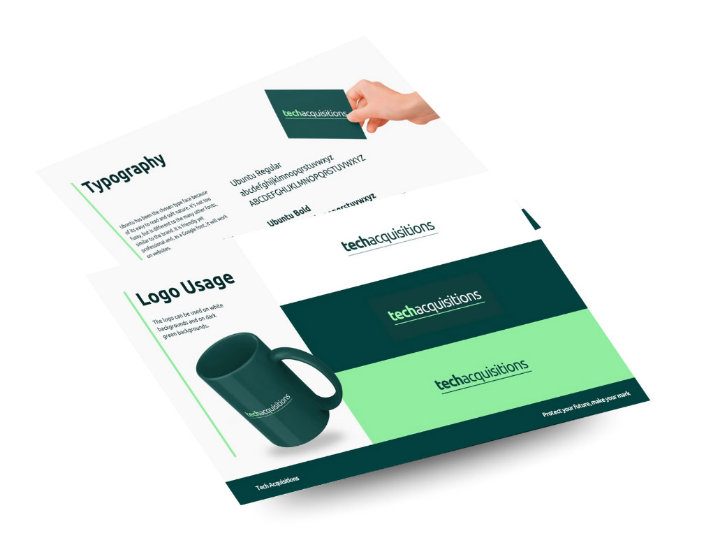 I was approached by Tech Acquisitions to support them with a rebranding project. Tech Acquisitions are a young and fresh team of acquisition specialists focusing on the Tech & IT industries. As such the team needed an element of vibrancy to their branding, which was established through the use of mint green. The green connecting them with their value proposition of creating wealth and wellbeing for business owners looking to exit their businesses.